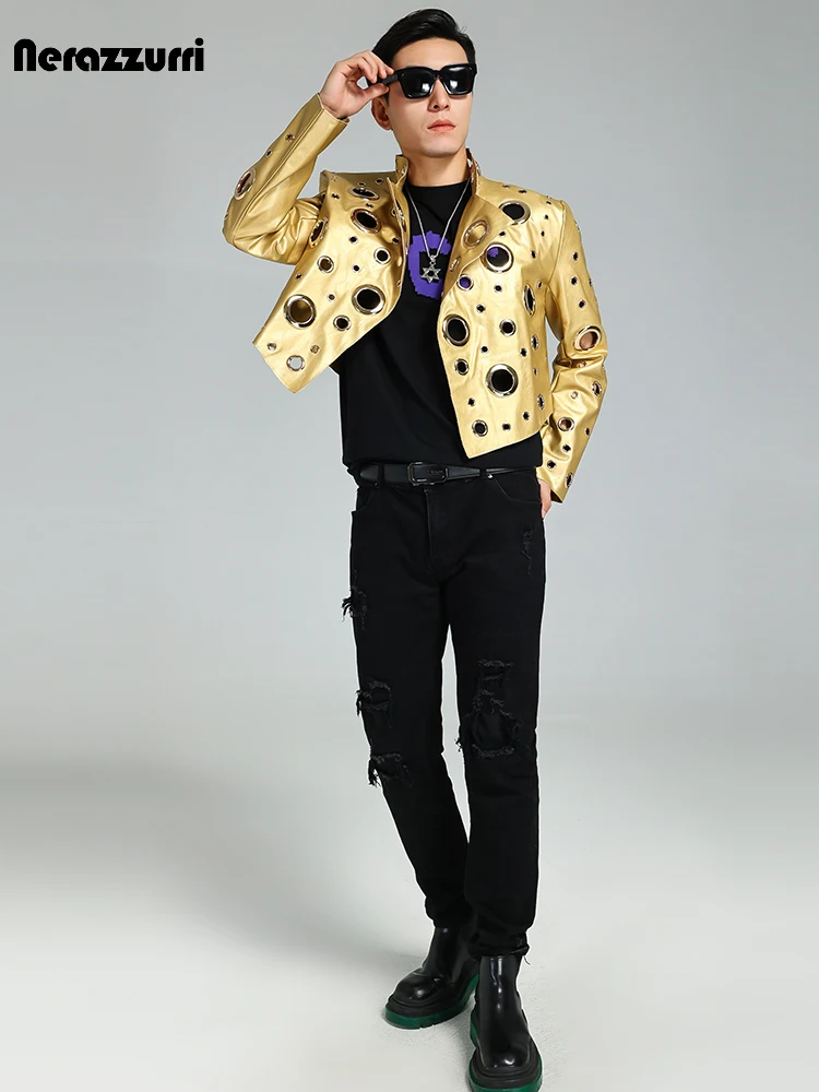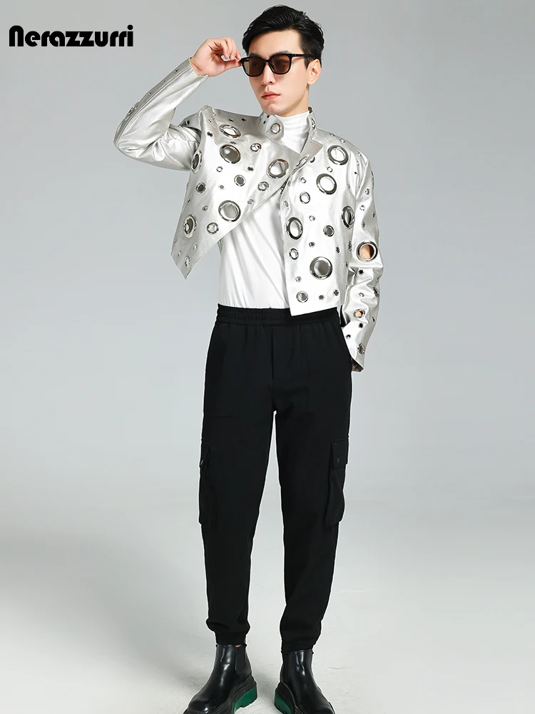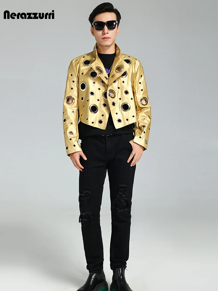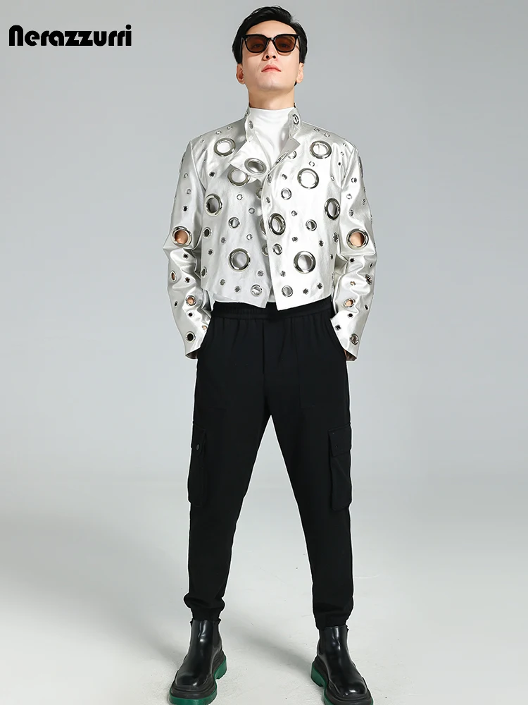 Nerazzurri Spring Autumn Cool Handsome Short Hollow Out Pu Leather Jacket Men with Holes Luxury Designer Unisex Y2K Streetwear